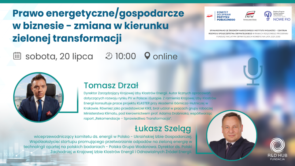Zapraszamy do udziału w webinarze „Prawo energetyczne/gospodarcze w biznesie – zmiana w kierunku zielonej transformacji”, który odbędzie się 20 lipca o godzinie 10.00