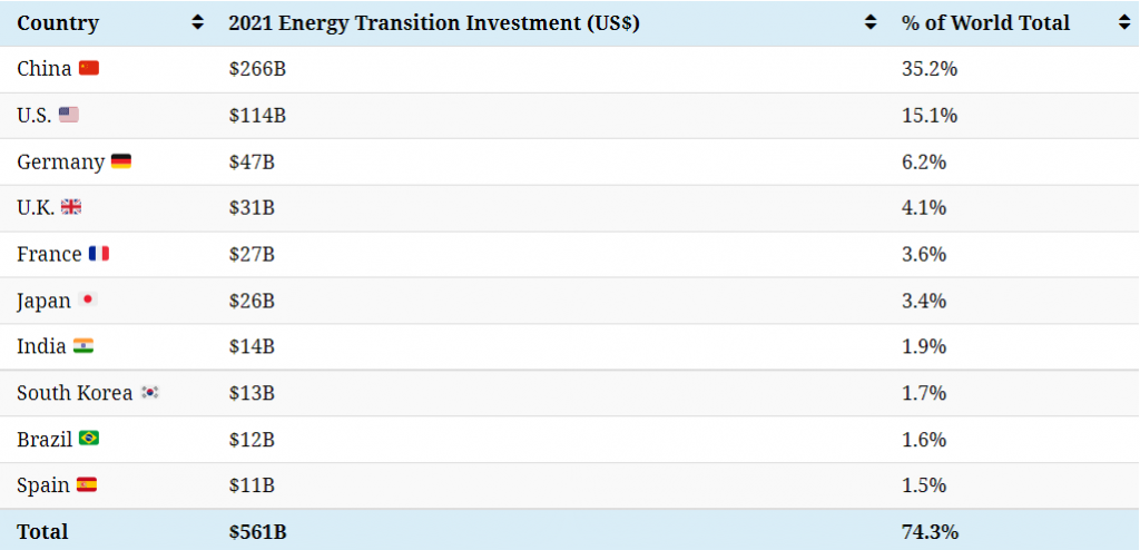 W rankingu 10 krajów z największym nakładem inwestycji, łącznie zainwestowały one 561 miliardów dolarów w transformację energetyczną, czyli prawie trzy czwarte całej światowej.
