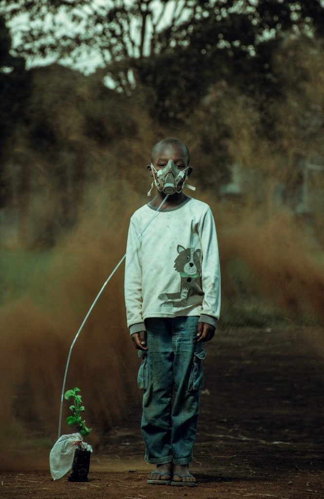 Zdjęcie Kevina Ochienga Onyango „The Last Breath” zdobyło nagrodę w kategorii Climate Action. Obraz przedstawia chłopca wdychającego powietrze przefiltrowane przez roślinę, na tle burzy piaskowej.