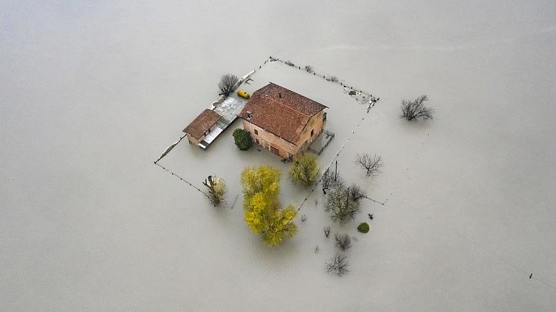 Zdjęcie przedstawia dom zatopiony w wyniku wylewu rzeki Panaro we włoskiej dolinie Padu po ulewnych deszczach i topniejącym śniegu.