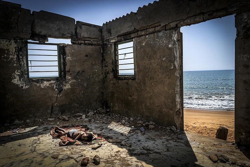 Zdjęcie podejmuje temat podnoszącego się poziomu mórz w krajach Afryki Zachodniej, który zmusza tysiące ludzi do opuszczenia swoich domów.