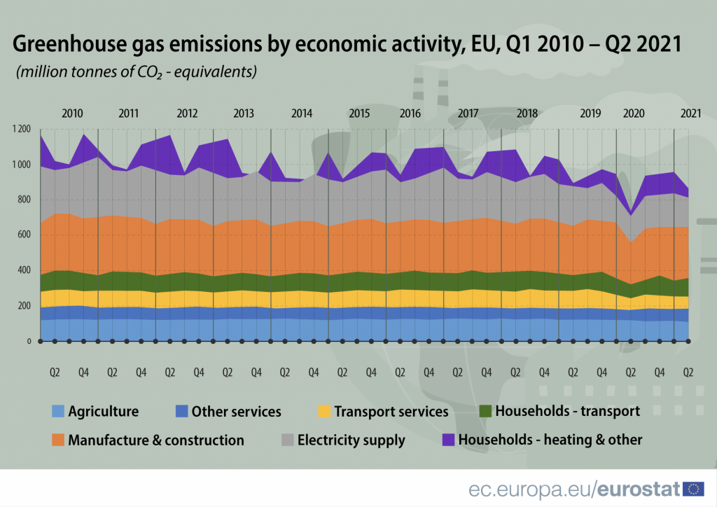 Eurostat podał, że emisje wyniosły 867 milionów ton ekwiwalentu CO2 od kwietnia do czerwca, co oznacza gwałtowny wzrost w porównaniu z tym samym okresem w zeszłym roku, kiedy to zatrzymanie gospodarki spowodowało, że emisje osiągnęły najniższy poziom w historii. Długofalowo, trend emisji gazów cieplarnianych w UE wykazuje stałą redukcję. Najnowsze dane pokazują, że w 2020 roku krajowe emisje gazów cieplarnianych w UE spadły o 31 proc. w porównaniu z poziomem z 1990 roku.
