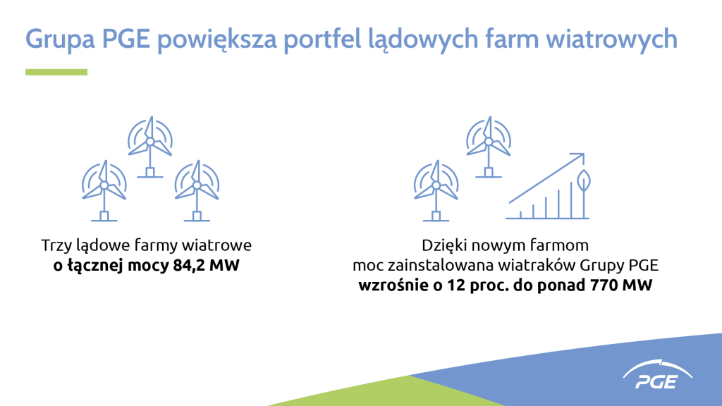 Grupa PGE umacnia się na pozycji lidera energetyki odnawialnej w Polsce. PGE podpisała umowę warunkową na nabycie trzech lądowych farm wiatrowych o łącznej mocy 84,2 MW. Po finalizacji transakcji moc zainstalowana Grupy PGE w tej technologii wzrośnie o 12 proc. do ponad 770 MW.
