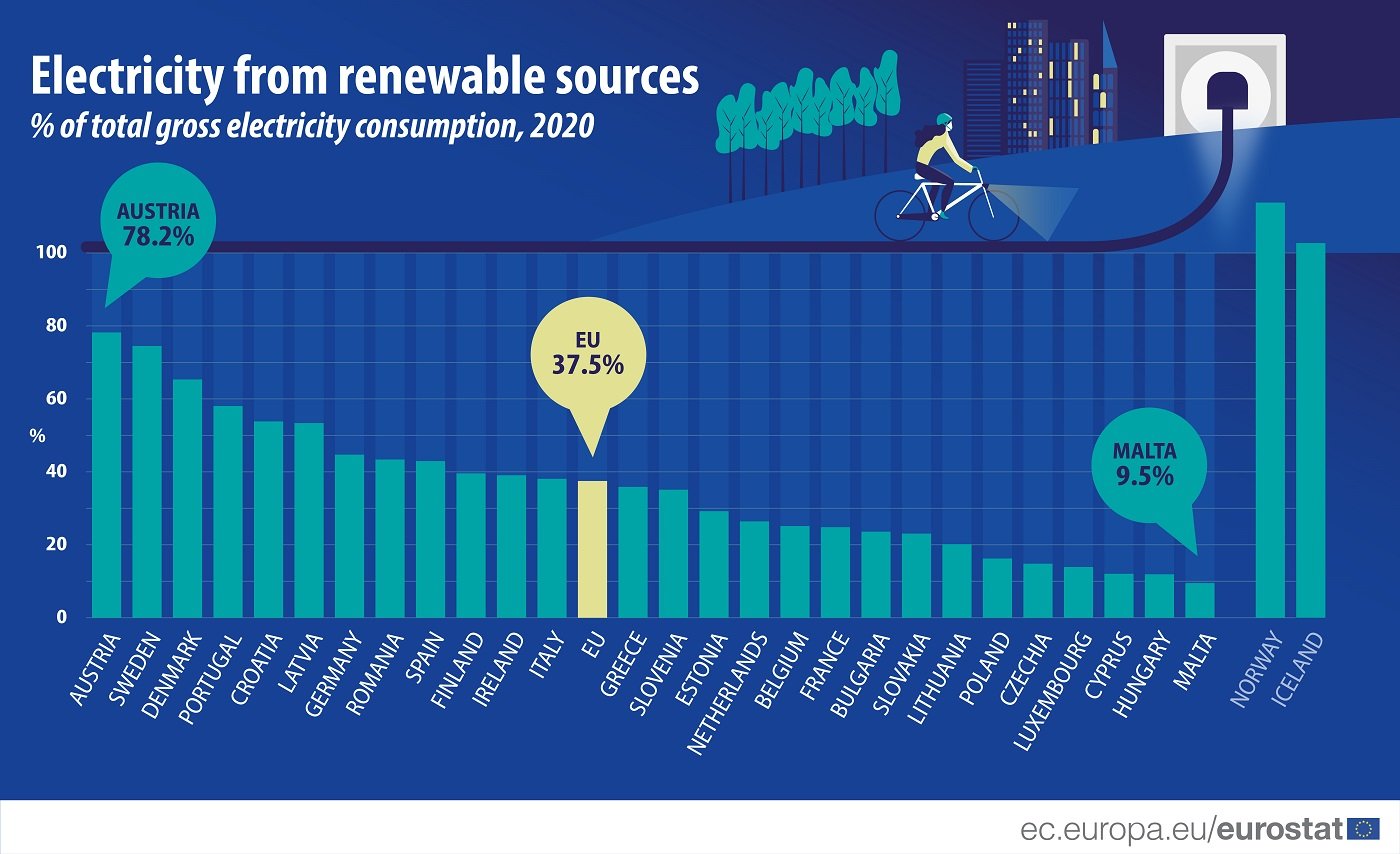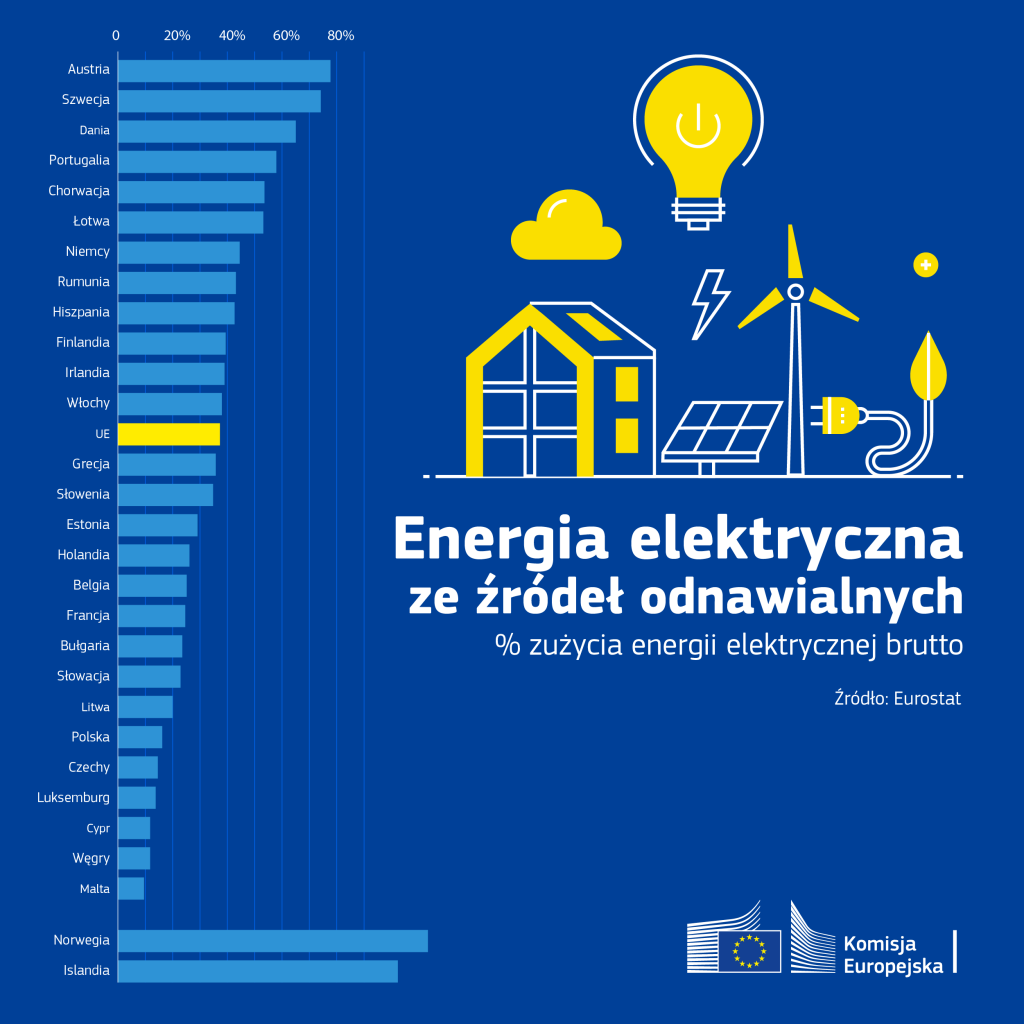 Największy udział energii z OZE miała Austria (78,2%), a najmniejszy Malta (9,5%). W Polsce udział energii elektrycznej ze źródeł odnawialnych wyniósł 16,2%.