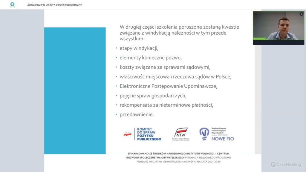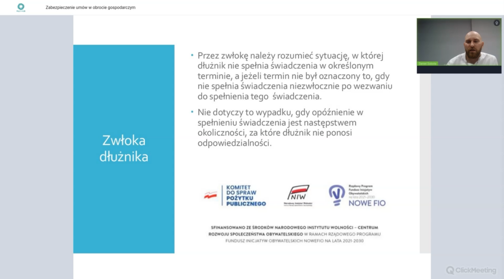Zapraszamy do zapoznania się z raportem „Zabezpieczenie umów w obrocie gospodarczym. Windykacja wierzytelności na wypadek nieterminowych płatności”, który odbył się 10 maja 2024 roku.