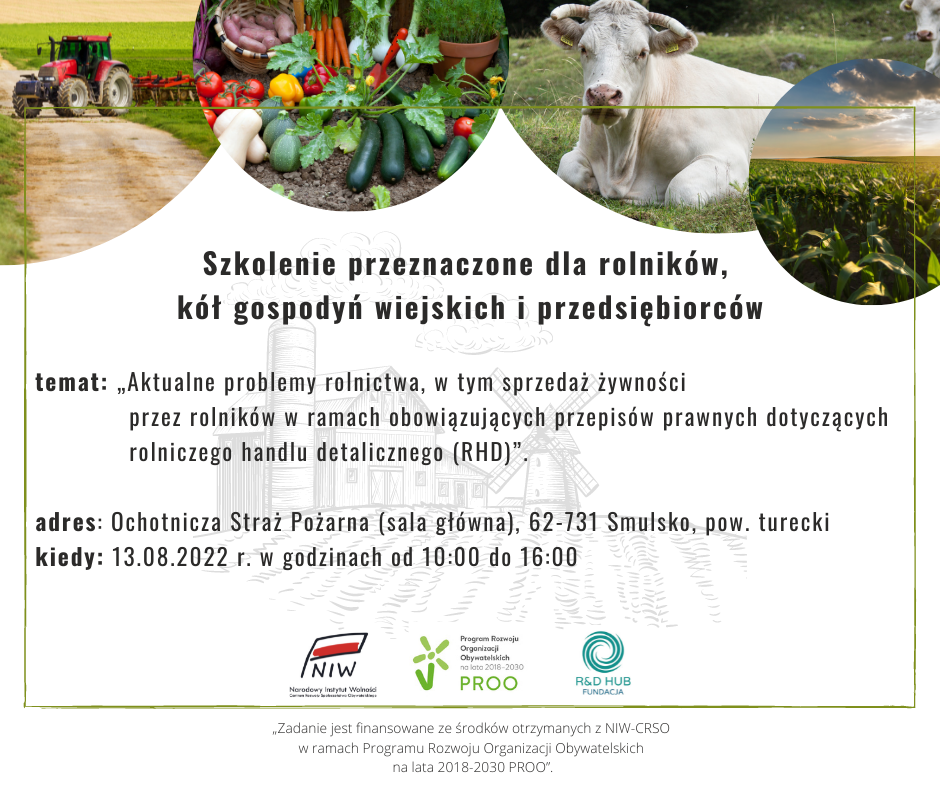 W dniu 13 sierpnia 2022 r. w godz. 10.00-16.00 w Sali OSP Smulsko (pow. turecki), zorganizowano czwarte szkolenie przeznaczone dla rolników, kół gospodyń wiejskich i przedsiębiorców w temacie: „Aktualne problemy rolnictwa, w tym sprzedaż żywności przez rolników w ramach obowiązujących przepisów prawnych dotyczących rolniczego handlu detalicznego (RHD)”.