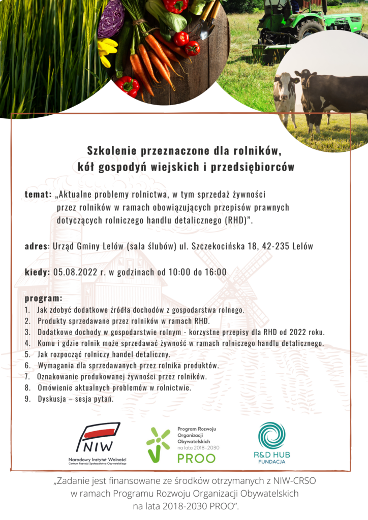 W dniu 5 sierpnia 2022 r. w godz. 10.00-16.00 w Sali konferencyjnej Urzędu Gminy Lelów (Śląskie), zorganizowano trzecie szkolenie przeznaczone dla rolników, kół gospodyń wiejskich i przedsiębiorców w temacie: „Aktualne problemy rolnictwa, w tym sprzedaż żywności przez rolników w ramach obowiązujących przepisów prawnych dotyczących rolniczego handlu detalicznego (RHD)”. W szkoleniu uczestniczyli rolnicy głównie z powiatu częstochowskiego. Była to grupa zajmująca się różną produkcją rolniczą, głównie produkcją miodów oraz małym przetwórstwem warzyw i owoców. Wśród uczestników znalazły się także bardzo aktywne członkinie kół gospodyń wiejskich. Uczestnicy wysłuchali przygotowanej prezentacji oraz zapoznali się z materiałem filmowym pokazującym konkretne przykłady RHD. Uczestnicy byli bardzo zainteresowani prezentowaną tematyką. Na koniec spotkania zadawali dużo pytań dotyczących możliwości podjęcia przez rolnika handlu detalicznego przy małej produkcji owoców, warzyw czy miodów w gospodarstwie rolnym.
