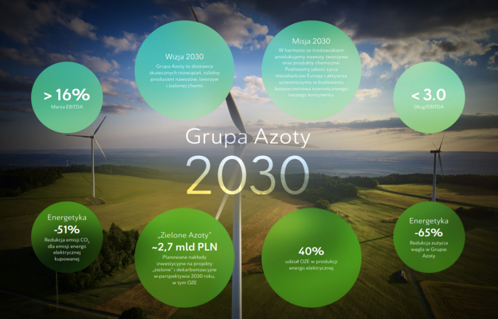 Grupa Azoty w strategii do 2030 zakłada uruchomienie projektu „Zielone Azoty”, którego głównym celem będzie m.in. dekarbonizacja i zmniejszenie emisyjności instalacji Grupy, realizacja projektów badawczorozwojowych, zgodnych z założeniami Europejskiego Zielonego Ładu oraz wdrożenie nowych rozwiązań w obszarze ekologicznych i zeroemisyjnych źródeł energii OZE, m.in. fotowoltaiki i energii wiatrowej. Nakłady inwestycyjne na projekty „zielone” i dekarbonizacyjne wyniosą blisko 2,7 mld zł.