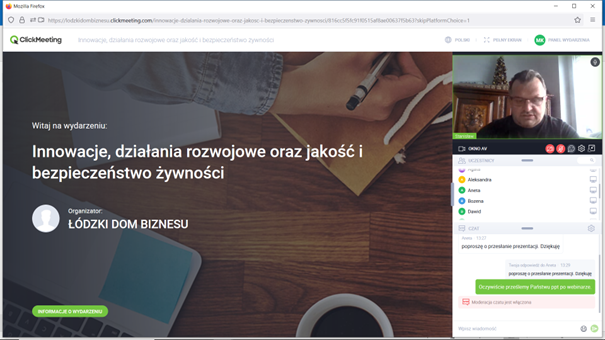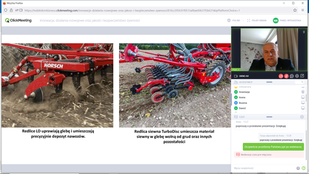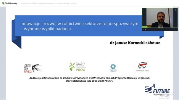Webinar rozpoczął się od podsumowania poziomu innowacyjności polskiego rolnictwa i sektora rolno-spożywczego. Zebrani online uczestnicy zapoznali się z wynikami raportu jakie zaprezentował dr Janusz Kornecki, ekspert i Prezes w E4FUTURE sp. z o.o.. Druga prezentacja poprowadzona przez Piotra Szablewskiego, dotycząca oferty ARiMR, przybliżyła możliwości pozyskania zewnętrznego finansowania MŚP na wykonywanie działalności w zakresie przetwórstwa lub wprowadzenia do obrotu produktów rolnych. Wsparcie finansowe w tym naborze można przeznaczyć na zakup i instalację nowych maszyn i urządzeń do przetwarzania, przechowywania, magazynowania, przygotowania do sprzedaży lub wprowadzania do obrotu produktów rolnych, rybołówstwa lub akwakultury, ale również na zakup nowych środków transportu wykorzystywanych do gospodarki magazynowej oraz do przewozu i wprowadzania do obrotu produktów rolnych, rybołówstwa lub akwakultury lub produktów wytworzonych z tych produktów w wyniku prowadzonej działalności w zakresie przetwórstwa. Do wydatków kwalifikowalnych zalicza się ponadto, budowę, w tym rozbudowę i nadbudowę, przebudowę lub remont budynków i budowli przeznaczonych do przetwarzania, przechowywania, magazynowania, przygotowania do sprzedaży lub wprowadzania do obrotu produktów rolnych, rybołówstwa lub akwakultury, obiektów infrastruktury towarzyszącej związanej z wykonywaną działalnością w zakresie przetwórstwa lub wprowadzania do obrotu produktów rolnych, rybołówstwa lub akwakultury oraz gospodarowania odpadami i ochroną środowiska. Wyjaśniono najważniejsze zasady aplikowania oraz przedstawiono harmonogram kolejnych naborów w tym mechanizmie finansowania.