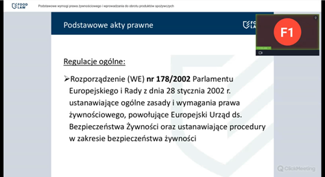 Webinar był przeznaczony dla wszystkich przedsiębiorców, który zamierzają zacząć lub już prowadzą działalność biznesową w sektorze spożywczym. Zostały na nim omówione podstawowe wymogi prawne dotyczące rozpoczęcia takiej działalności (w tym rejestracyjne), przepisy dotyczące bezpieczeństwa, jakości oraz znakowania takich produktów, a także odpowiedzialności prawnej za ich wprowadzanie do obrotu.